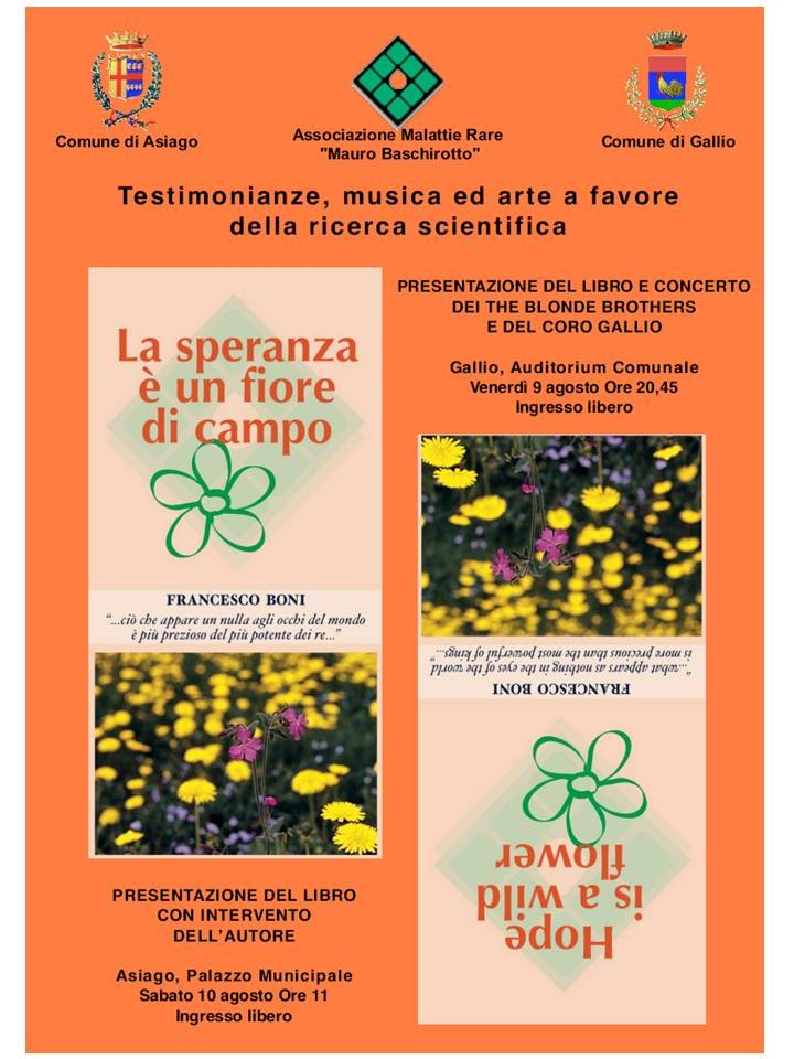 Due manifestazioni di arte e cultura per presentare al pubblico il libro “La speranza è un fiore di campo” e il suo autore, Francesco Boni che è stato ospitato Sabato 10 Agosto alle ore 11.00 presso la Sala Consigliare del Comune di Asiago.