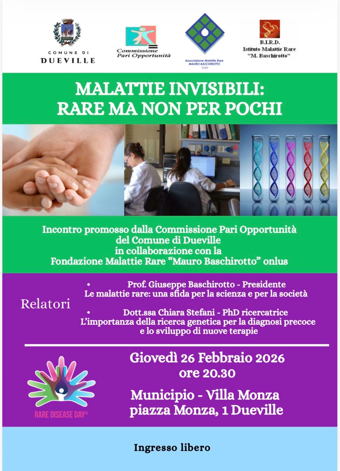 In occasione della Giornata delle Malattie Rare, il Comune di Dueville, attraverso la Commissione Pari Opportunità, promuove un incontro di informazione e sensibilizzazione dedicato alle malattie rare, spesso invisibili ma che coinvolgono migliaia di persone e famiglie.