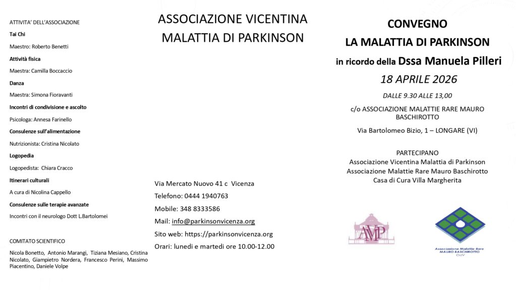 L’Associazione Vicentina per la Malattia di Parkinson, con gli Specialisti del suo Comitato Scientifico ed in collaborazione con l’Associazione Malattie Rare Mauro Baschirotto, ha organizzato questo incontro incentrato sull’informazione scientifica, in ricordo della dottoressa neurologa Manuela Pilleri la mattina di SABATO 18 APRILE 2026 presso la sede del nostro Istituto a Longare , in via B. Bizio 1.