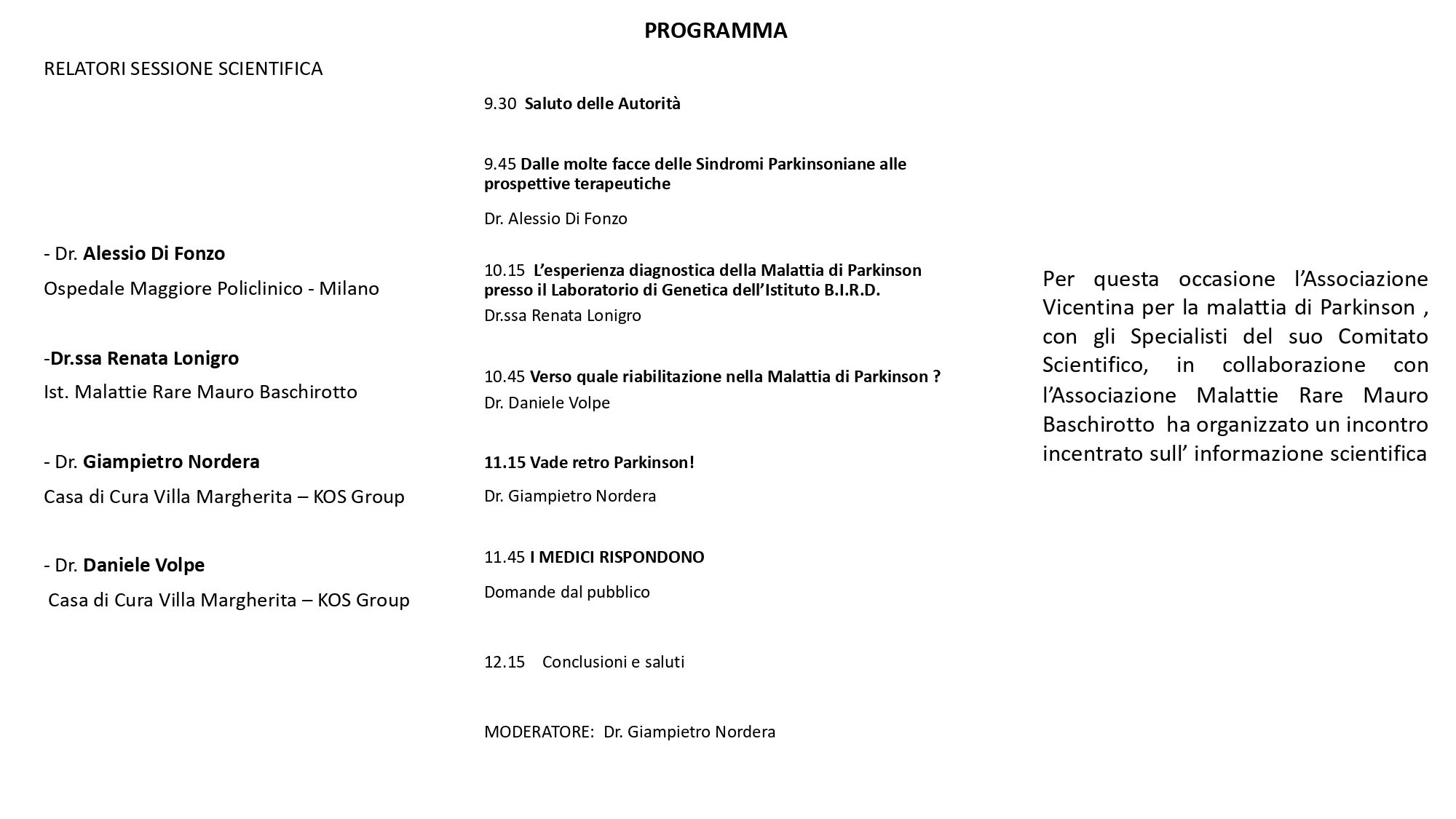 L’Associazione Vicentina per la Malattia di Parkinson, con gli Specialisti del suo Comitato Scientifico ed in collaborazione con l’Associazione Malattie Rare Mauro Baschirotto, ha organizzato questo incontro incentrato sull’informazione scientifica, in ricordo della dottoressa neurologa Manuela Pilleri la mattina di SABATO 18 APRILE 2026 presso la sede del nostro Istituto a Longare , in via B. Bizio 1.