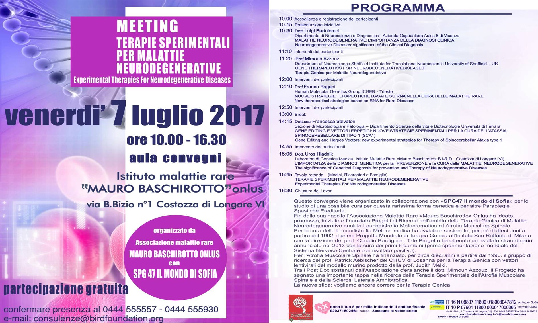 In collaborazione con “SPG47 il mondo di Sofia” questo convegno pone le basi per lo studio di una possibile cura per questa rarissima forma genetica e per altre Paraplegie Spastiche Ereditarie.