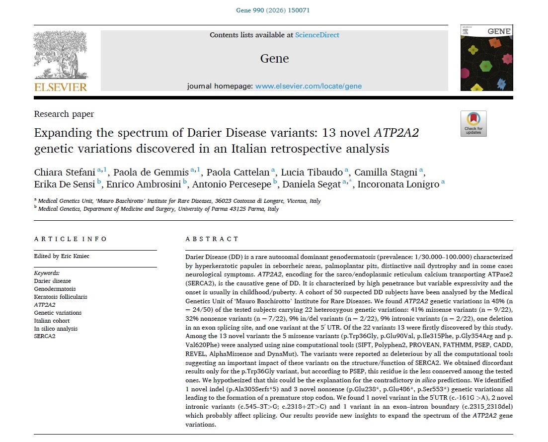 E’ appena stato pubblicato il nostro studio sugli aspetti genetici della Malattia di DARIER in cui sono state riportate per la prima volta 13 nuove varianti del gene ATP2A2.